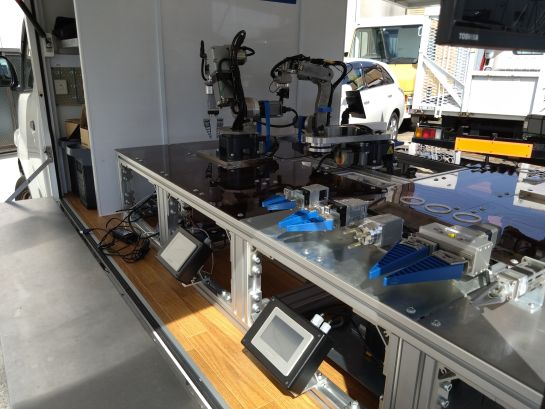 自社製品の産業用機械を車内に展示、実際に稼働するようにセッテイングし、営業活動に役立てておられます。