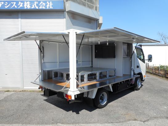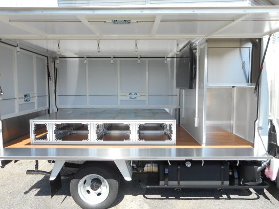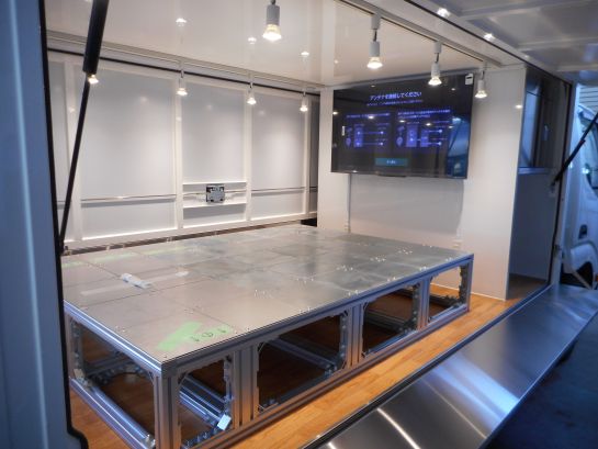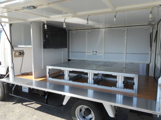 大きすぎず小さすぎずの車両をベース車とし、3方開の展示室としています。地下駐車場にも入れる高さです。